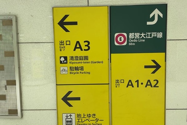 出口を出ると「猿江恩賜公園」と「錦糸町駅」の看板が目の前に見えるので、右方向に歩きます。※錦糸町駅方向と逆方向に歩きます。
