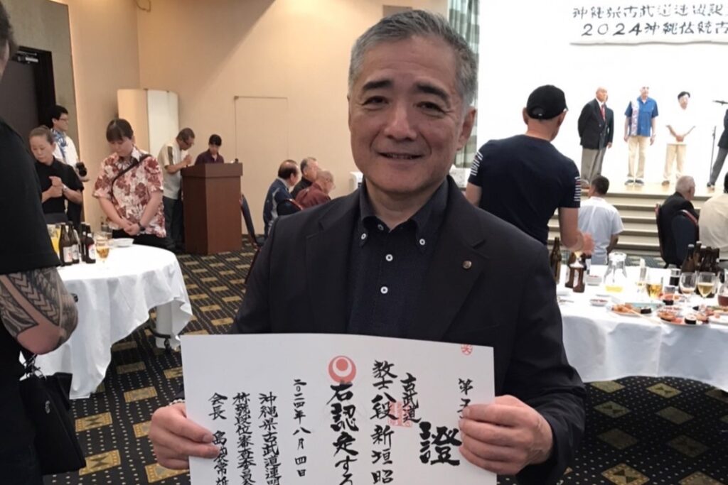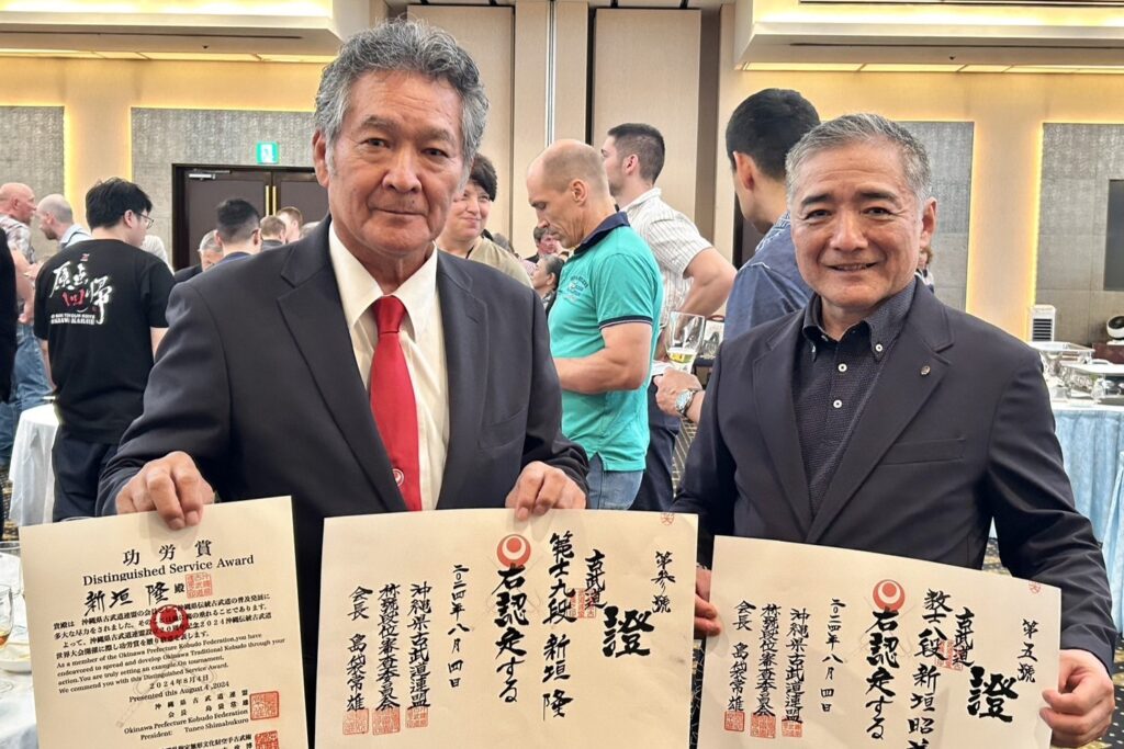 沖縄県古武道連盟功労賞の贈呈式が8月4日、2024沖縄伝統古武道世界大会さよならパーティーの場で開催されました。沖縄県伝統古武道の普及発展に尽くした功績をたたえ、琉球古武道賢亮流協会東京支部会長の新垣隆先生(66)-範士九段へ沖縄県古武道連盟会長の島袋常雄先生より表彰状が贈られました。